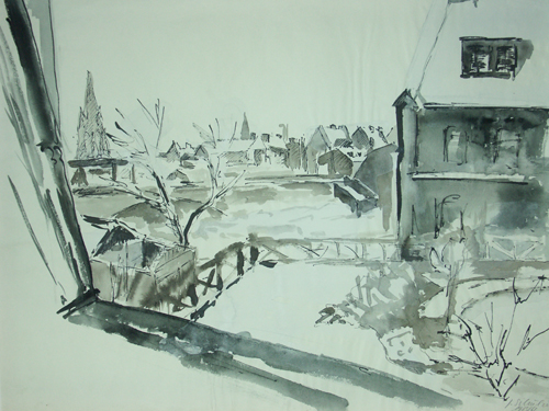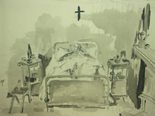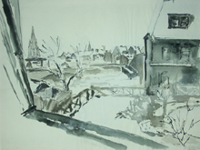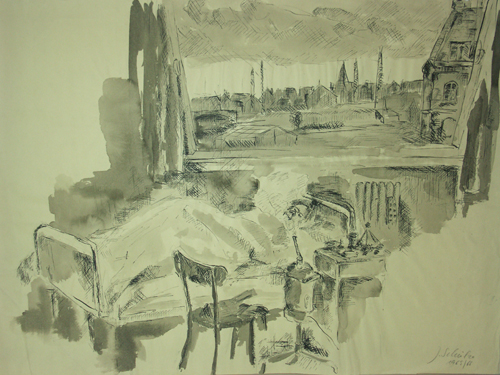 |  "Kranker im Bett", Bleistift laviert |  "Blick auf Köln-Ehrenfeld", Mischtechnik |  "Krankenzimmer" |