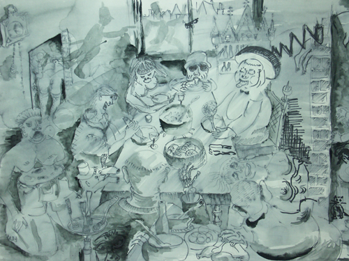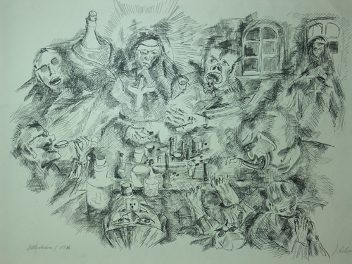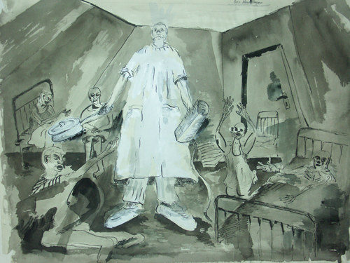 |  "Pillenausgabe", Tusche |  "Der Heimpfleger", Tusche laviert |  "Patienten am Tisch", Bleistift laviert |